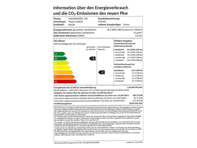 Qualitätssiegel Zertifizierte Gebrauchtwagen; 1. Hand; Scheckheftgepflegt; Anschlussgarantie, Laufzeit 3 Jahre im Anschluss an die Herstellergarantie, maximale Gesamtlaufleistung 100.000 km; IQ.LIGHT - HD-Matrix-Scheinwerfer; 'IQ.LIGHT' - HD-Matrix-Scheinwerfer; Navigationssystem; Infotainment-Paket 'Discover Pro Max'; Panorama-Ausstell-/Schiebedach mit Panoramadach hinten; Head-up-Display; Leuchtweitenregulierung dynamisch, mit dynamischem Kurvenfahrlicht; Automatische Distanzregelung ACC 'stop & go'; Dynamischer Fernlichtassistent 'Dynamic Light Assist'; Umgebungsansicht 'Area View' inkl. Rückfahrkamera 'Rear View'; Fahrassistent 'Travel Assist', Spurhalteassistent 'Lane Assist' und 'Emergency Assist'; Digital Cockpit Pro, mehrfarbig, verschiedene Info-Profile wählbar; 3D-LED-Rückleuchten mit dynamischer Blinkleuchte; Spurwechselassistent 'Side Assist', Ausparkassistent und Ausstiegswarnung; Vordersitze und äußere Rücksitze beheizbar, Sitzfläche und -lehne getrennt einstellbar; Regensensor; Berganfahrassistent; Mit Verkehrszeichenerkennung; Winterpaket 'Plus'; Digitaler Radioempfang DAB+; Multifunktionslenkrad in Leder, beheizbar, mit Schaltwippen; Memory-Funktion für Parkassistent; Geschwindigkeitsbegrenzer mit vorausschauender Regelung; Anhängevorrichtung anklappbar, mit elektrischer Entriegelung; inkl. Anhängerrangierassistent Trailer Assist; Parkassistent 'Park Assist Pro', inkl. Einparkhilfe; Infotainment-System mit 38,1-cm-Display (15 Zoll); Adaptive Fahrwerksregelung DCC Pro inkl.Fahrprofilauswahl; Schlüsselloses Schließ- und Startsystem 'Keyless Access', mit berührungsloser Ver- und Entriegelung, SAFE-Verriegelung; Soundsystem 'Harman Kardon'; Soundsystem 'Harman Kardon', 10+1 Lautsprecher, 700 Watt Gesamtleistung, digitaler 16-Kanal-Verstärker, Subwoofer; Klimaanlage 'Air Care Climatronic' mit Aktiv-Kombifilter, Bedienelementen hinten und 3-Zonen-Temperaturregelung; Diebstahlwarnanlage mit Innenraumüberwachung, Back-up-Horn und Abschleppschutz; Frontscheibe in Verbundsicherheitsglas, drahtlos beheizbar und infrarot-reflektierend, geräuschdämmend; App-Connect Wireless für Apple CarPlay und Android Auto; Sprachassistent IDA und elektronische Sprachverstärkung; 4 Leichtmetallräder 'Cannes' 8 J x 20 in Schwarz, Oberfläche glanzgedreht; Winterräder 'Napoli' (zusätzlich), 4 Leichtmetallräder 7,5 J x 18, Winterreifen 235/55 R 18 H; Innenspiegel automatisch abblendend; Dachreling silber eloxiert; Heckklappe mit sensorgesteuerter Öffnung und zeitverzögerter elektrischerSchließung, mit Fernentriegelung; Ambientebeleuchtung 30-farbig, in der Instrumententafel sowie in den Türen; Dekoreinlagen vorn durchleuchtet; E-Motor (Hybrid) Systemleistung 150KW Aggr.0EC.A / 0EK.A; Ladekabel Mode 3 Typ 2, 16 A; Assistenzpaket 'IQ.DRIVE'