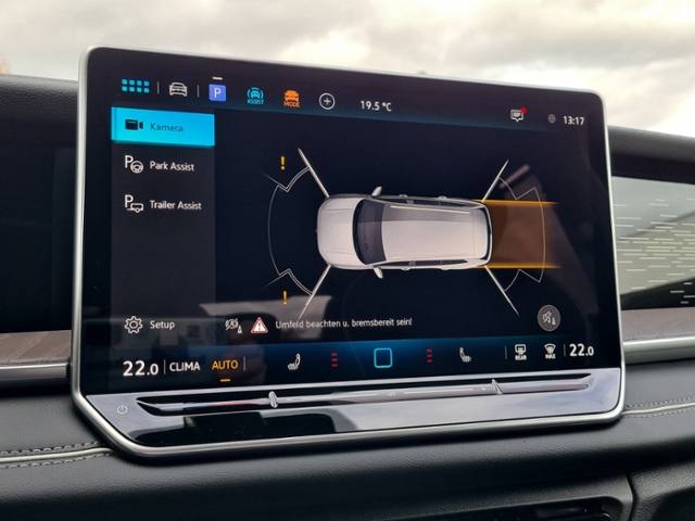 Anschlussgarantie, Laufzeit 3 Jahre im Anschluss an die Herstellergarantie, maximale Gesamtlaufleistung 100.000 km; Navigationssystem; IQ.LIGHT - HD-Matrix-Scheinwerfer; 'IQ.LIGHT' - HD-Matrix-Scheinwerfer; Automatische Distanzregelung ACC 'stop & go'; Dynamischer Fernlichtassistent 'Dynamic Light Assist'; Umgebungsansicht 'Area View' inkl. Rückfahrkamera 'Rear View'; Fahrassistent 'Travel Assist', Spurhalteassistent 'Lane Assist' und 'Emergency Assist'; Digital Cockpit Pro, mehrfarbig, verschiedene Info-Profile wählbar; Spurwechselassistent 'Side Assist', Ausparkassistent und Ausstiegswarnung; Anhängevorrichtung inkl. Anhängerrangierassistent 'Trailer Assist'; Vordersitze beheizbar, Sitzfläche und -lehne getrennt einstellbar; Regensensor; Mit Verkehrszeichenerkennung; Multifunktionslenkrad in Leder, beheizbar, mit Schaltwippen; Geschwindigkeitsbegrenzer mit vorausschauender Regelung; Anhängevorrichtung anklappbar, mit elektrischer Entriegelung; inkl. Anhängerrangierassistent Trailer Assist; Parkassistent 'Park Assist Pro', inkl. Einparkhilfe; Schlüsselloses Schließ- und Startsystem 'Keyless Access', mit berührungsloser Ver- und Entriegelung, SAFE-Verriegelung; Klimaanlage 'Air Care Climatronic' mit Aktiv-Kombifilter, Bedienelementen hinten und 3-Zonen-Temperaturregelung; Telefonschnittstelle 'Comfort' mit induktiver Ladefunktion für 2 Smartphones, Ladeleistung bis zu 15 W; Diebstahlwarnanlage mit Innenraumüberwachung, Back-up-Horn und Abschleppschutz; App-Connect Wireless für Apple CarPlay und Android Auto; Außenspiegel elektrisch einstell-, anklapp- und beheizbar; auf Fahrerseite abblendend, Memory-Funktion; 4 Leichtmetallräder 'Catania' 7,5 J x 19 in Schwarz, Oberfläche glanzgedreht; Innenspiegel automatisch abblendend; Dachreling silber eloxiert; Vordersitze mit Massagefunktion; 'Easy Open & Close' - Heckklappe mit sensorgesteuerter Öffnung und Schließung, mit Fernentriegelung; Ambientebeleuchtung 30-farbig, in der Instrumententafel sowie in den Türen; Dekoreinlagen vorn durchleuchtet; Winterräder (zusätzlich), 4 Stahlräder 6,5 J x 17, Winterreifen 215/65 R 17 H; Türscheiben geräuschdämmend; Seitenscheiben hinten und Heckscheibe abgedunkelt; Infotainment-Paket 'Discover'; Infotainment-System mit 32,7-cm-Display (12,9 Zoll)